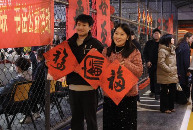 与此同时,场外的送春联活动也备受众人瞩目。书法家按照观众的要求,在长桌前尽情挥毫泼墨,其笔法行云流水,简简单单的一提一勾,就将一副副饱含喜气的春联创作完成。观众们接过充满祝福之意的春联,满载而归。