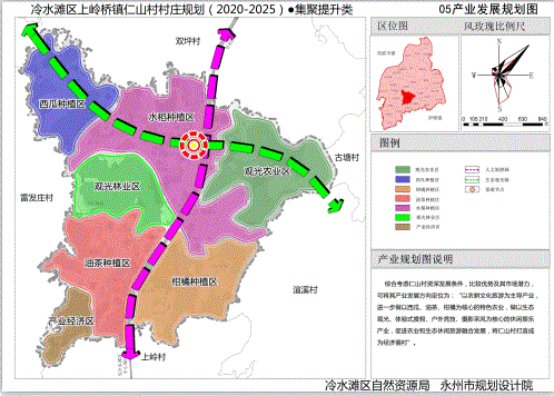 区位优越,交通便利。仁山村位于上岭桥镇东北部,北靠双坪村,西邻雷发庄村,东接渲溪村、古塘村,南连岚角山镇,祁冷快速通道南北向贯穿仁山村中部,向北与衡友线相接通往祁阳区中心,向南经县道 X018通往冷水滩区中心,同时村庄距西南向二广高速出入口约3公里,交通可达性较强,交通区位较好。仁山村位于上岭桥镇南部高效农业产业区和城镇发展轴上,是城镇向北扩展的主要连接点,经济区位优势明显。