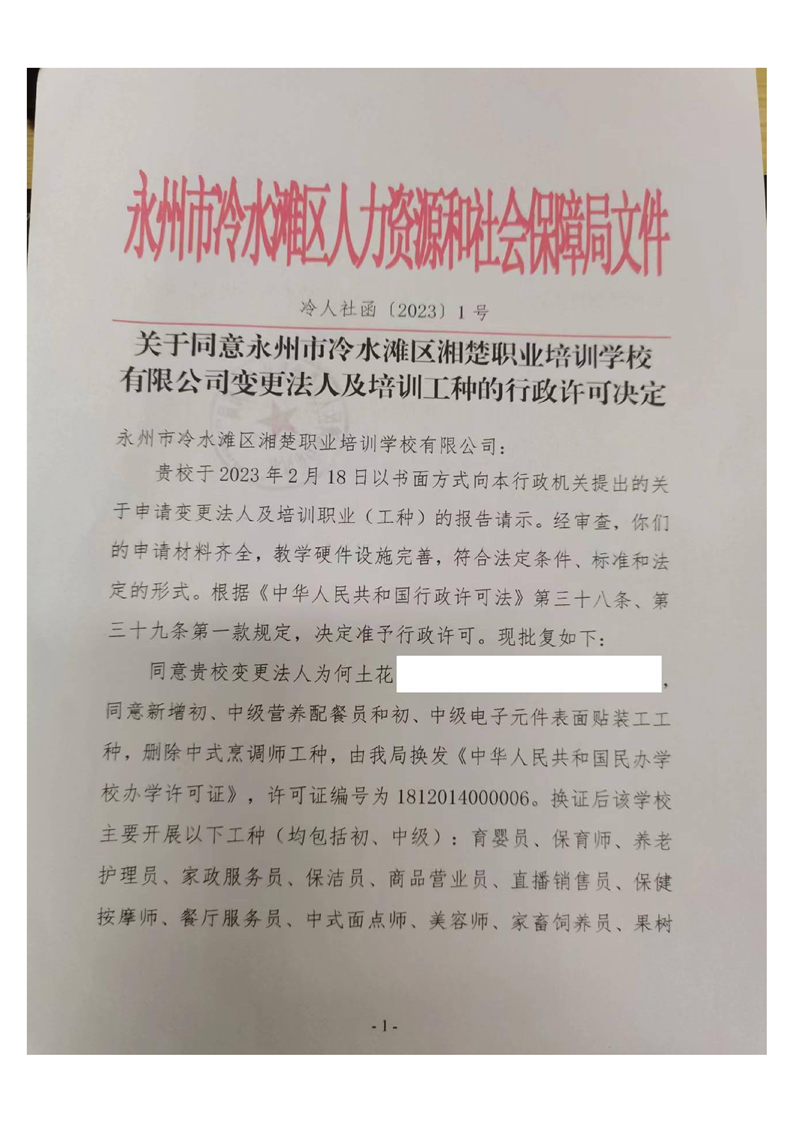 关于同意永州市冷水滩区湘楚职业培训学校有限公司变更法人及培训工种的行政许可决定