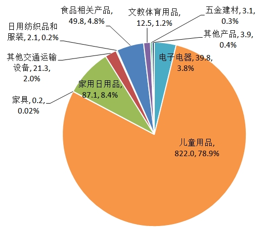 从产品类别看,召回数量较多的是儿童用品264次,涉及产品822.0万件,占召回总数量的78.9%;家用日用品42次,涉及产品87.1万件,占召回总数量的8.4%;食品相关产品74次,涉及产品49.8万件,占召回总数量的4.8%;电子电器146次,涉及产品39.8万件,占召回总数量的3.8%;其他交通运输设备127次,涉及产品21.3万件,占召回总数量的2.0%,详细分类见图4。