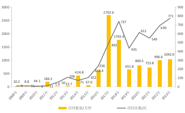 图3 2008—2023年消费品召回的次数与数量