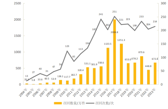 图1 2004—2023年汽车产品召回的次数与数量