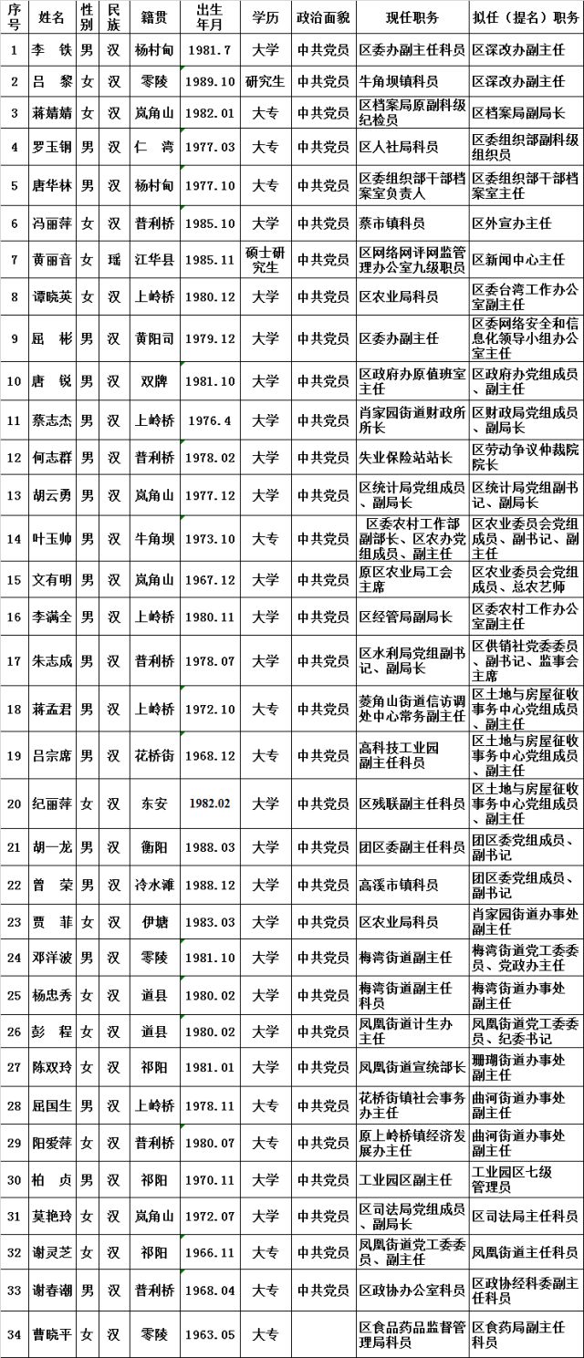 为了加强对干部选拔工作的监督,提高识别和任用干部的准确程度,现对区委常委会议研究决定的下列34名拟任(提名)人选进行任前公示: