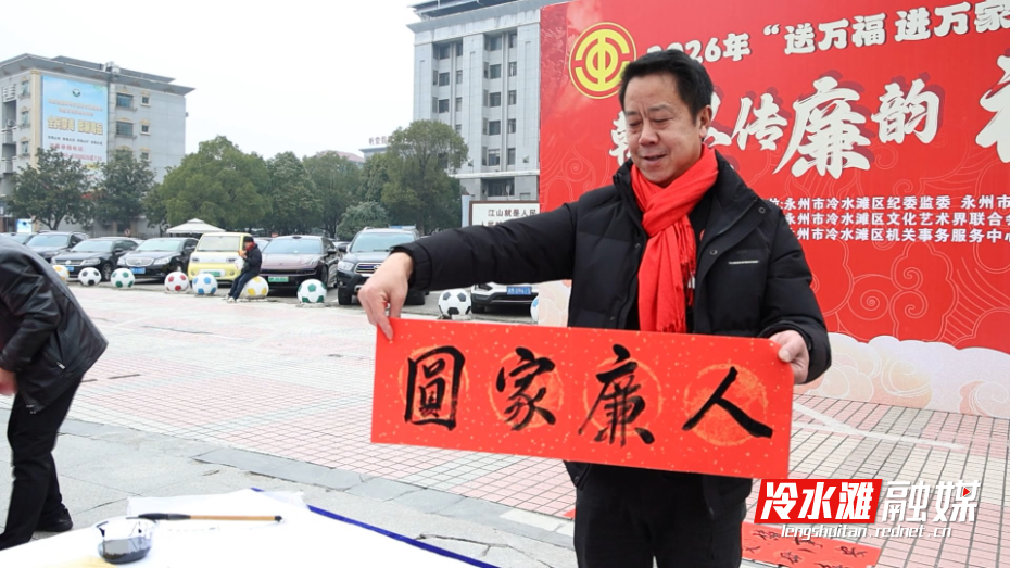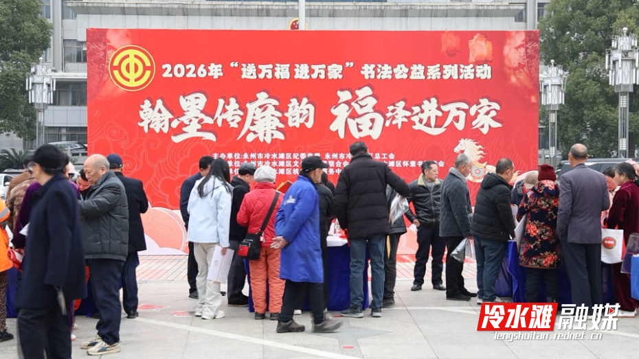 冷水滩融媒2月4日讯 (记者 陈彦希)2月4日上午,冷水滩区政府广场人头攒动、墨香四溢。区总工会联合区纪委监委、区文联等单位举办的2026年“送万福、进万家”书法公益系列活动拉开帷幕,为即将到来的新春佳节注入浓厚的文化气息与清廉风尚。