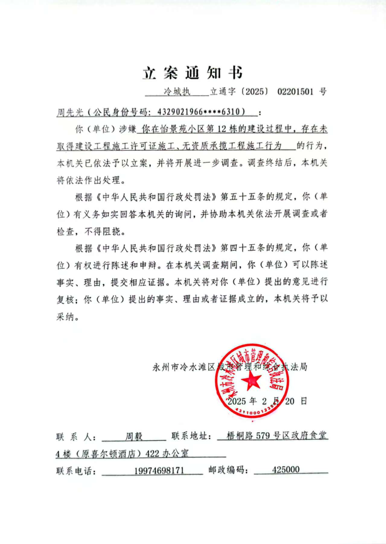 永州市冷水滩区城市管理和综合执法局《立案通知书》(冷城执调(询)通字〔2025〕02201501号)送达公告