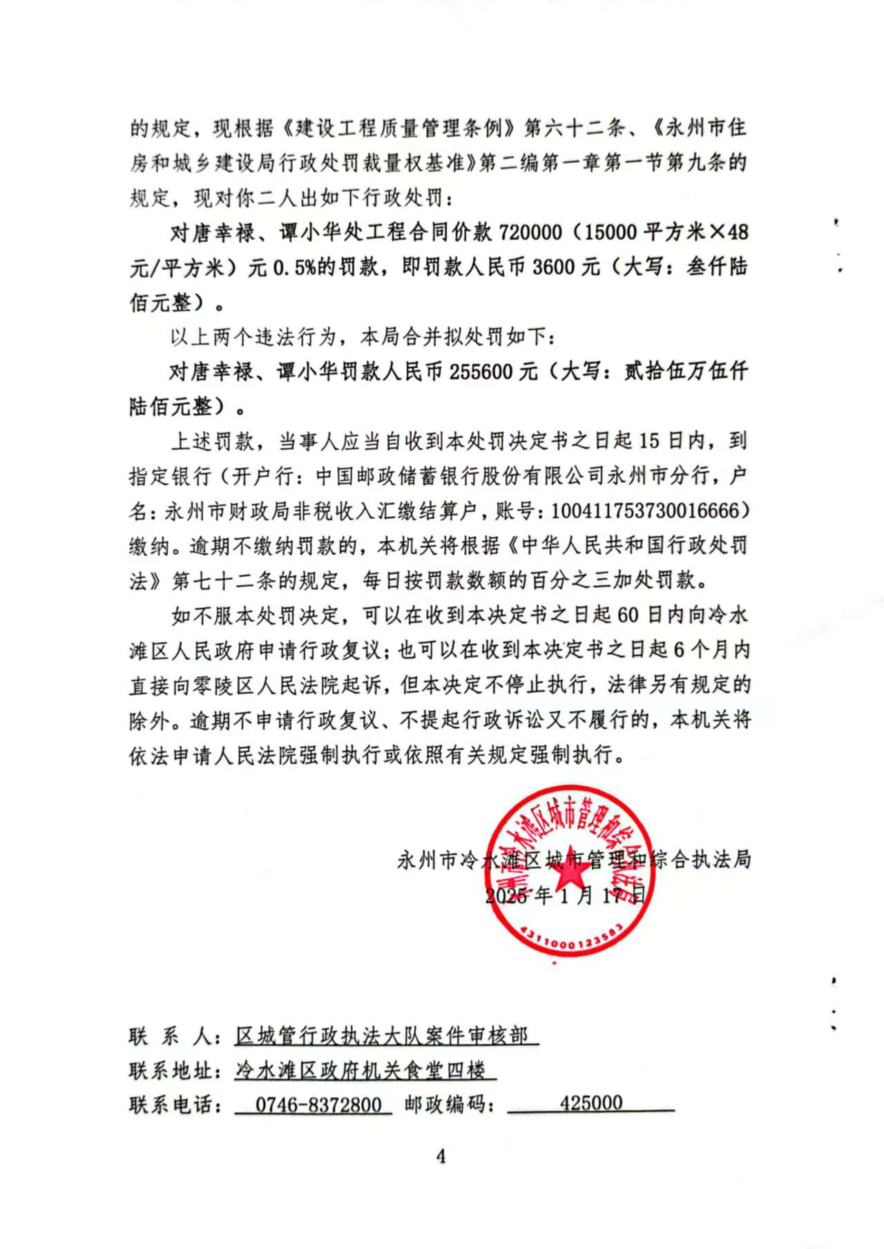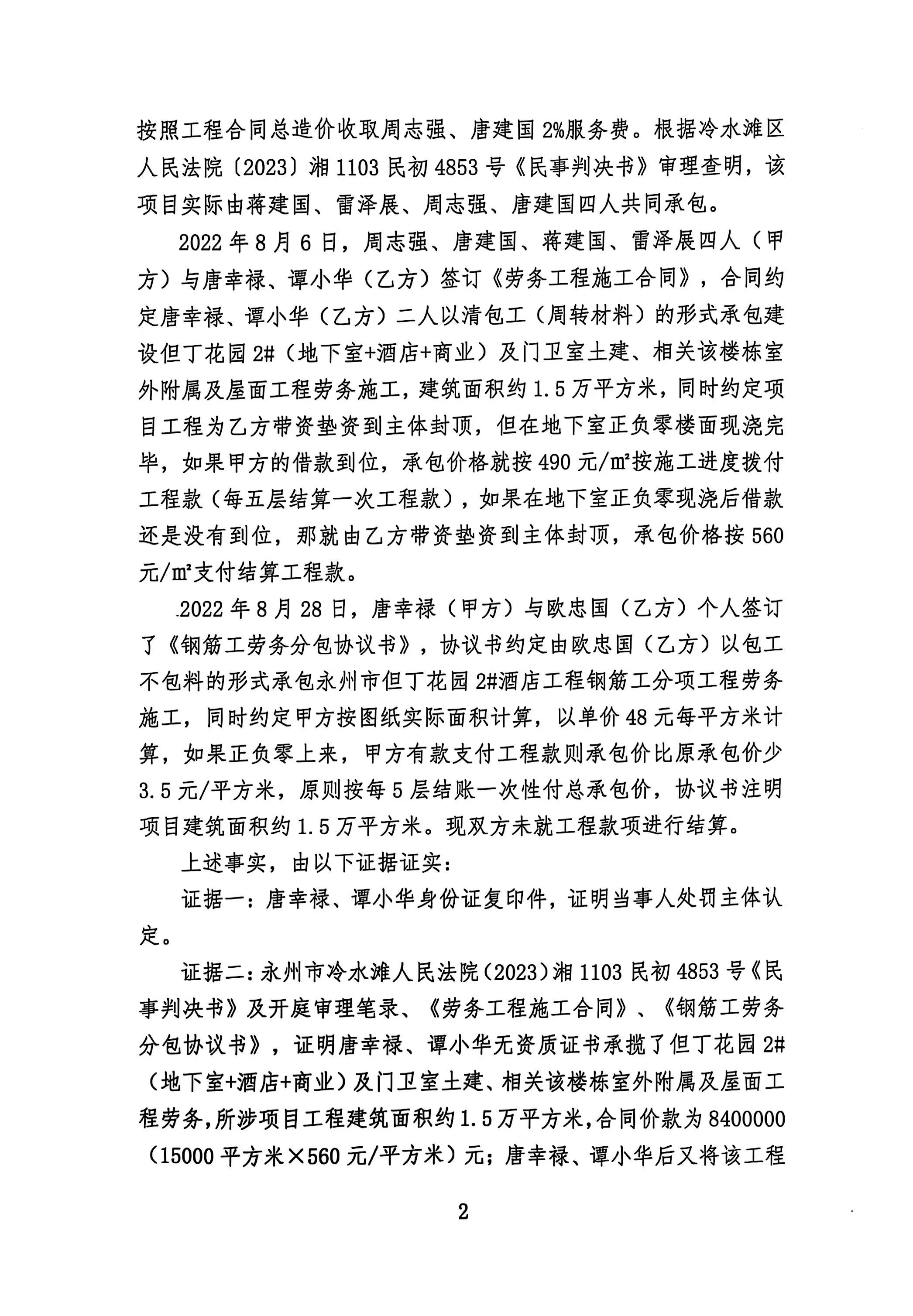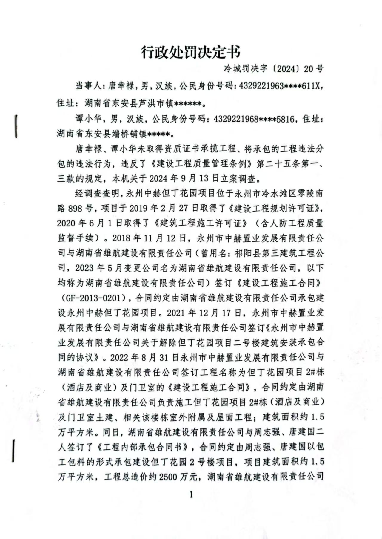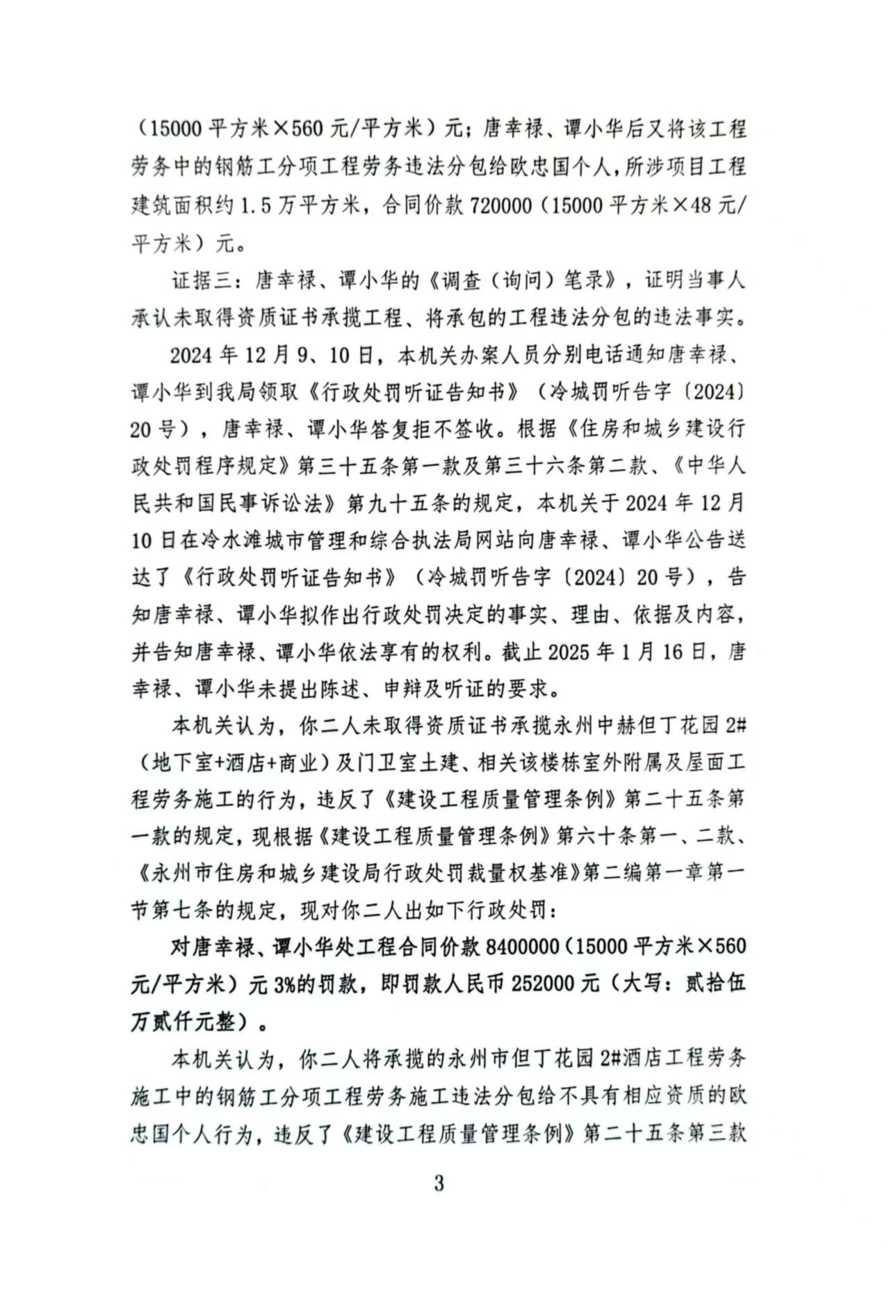 经查,永州中赫但丁花园二号工程项目建设过程中你二人存在未取得资质证书承揽工程的违法行为,本机关于2025年1月17日作出《行政处罚决定书》(冷城字〔202420)。由于采用其他方式均无法送达,现依据《住房和城乡建设行政处罚程序规定》第三十五条第一款及第三十六条第二款、《中华人民共和国民事诉讼法》第九十五条的规定,向你公告送达《行政处罚决定书》(冷城字〔202420),请你二人自公告发出之日起三十日内到我局领取上述文书正本,逾期即视为送达。(决定书内容如下)