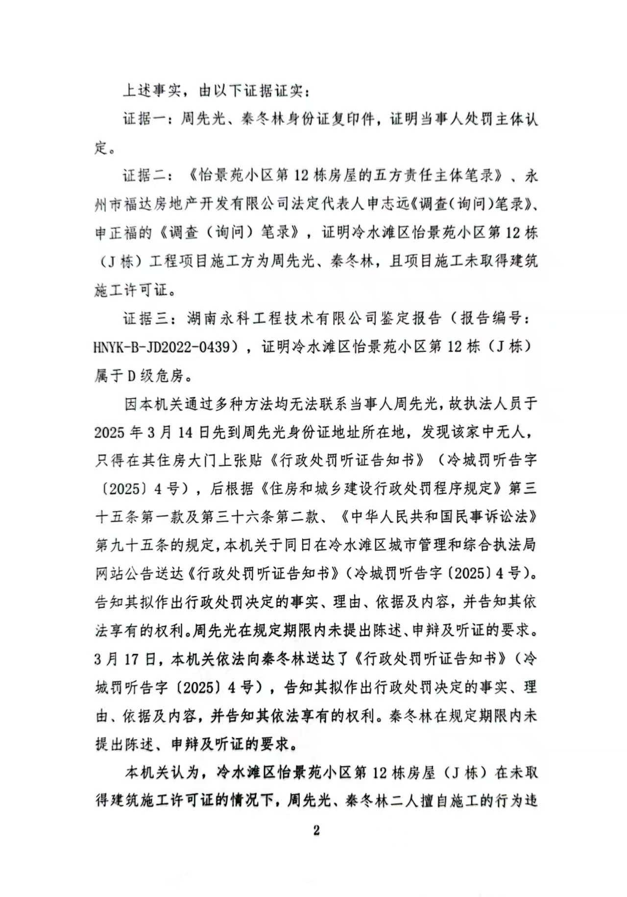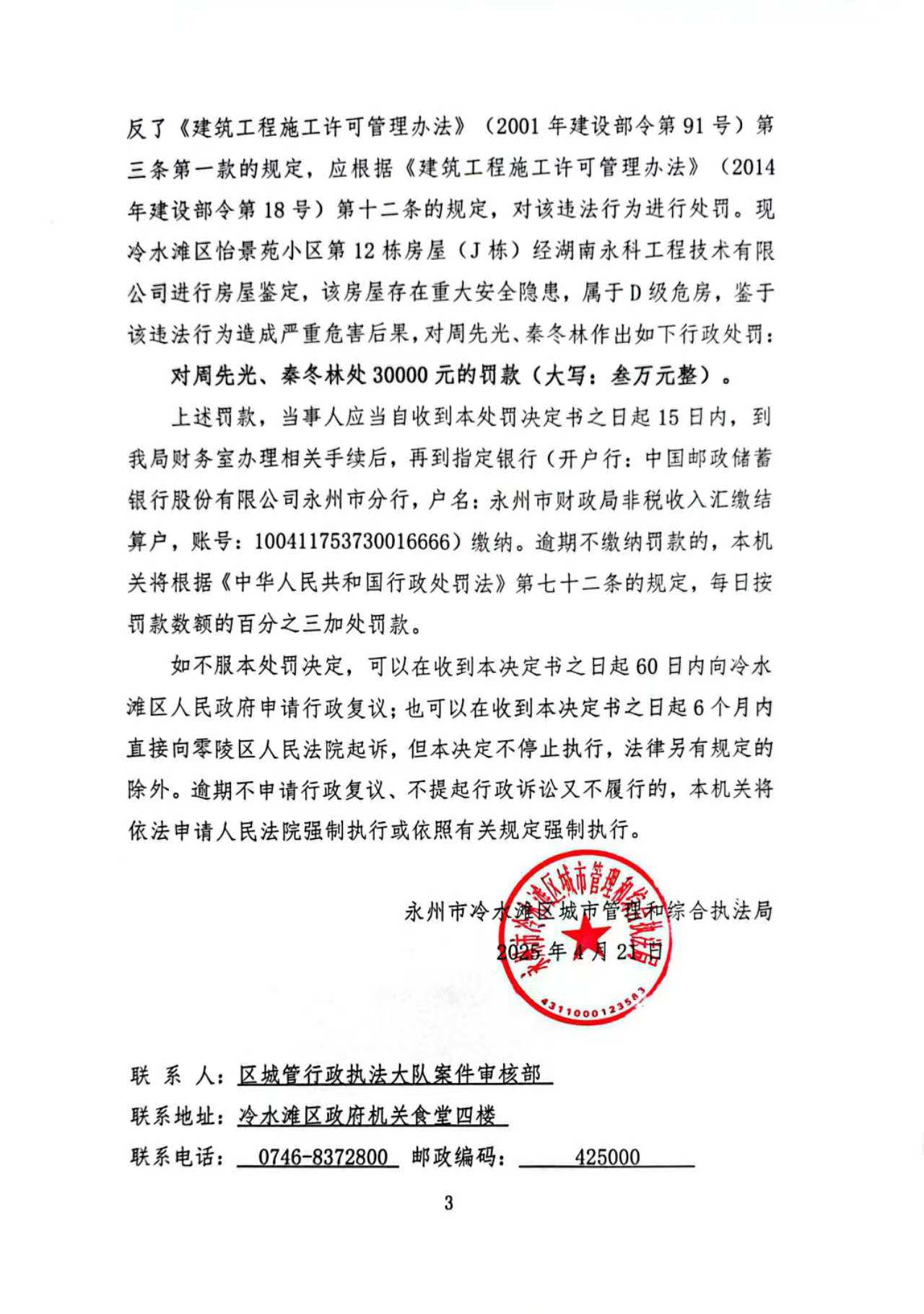 经查,永州市冷水滩区怡景苑小区第12栋房屋(J栋)项目建设过程中,你与秦冬林二人存在未取得施工许可证擅自施工的违法行为,本机关于2025年4月21日作出《行政处罚决定书》(冷城罚决字〔2025〕4号)。由于无法联系你本人,并且采用其他方式均无法送达,现依据《住房和城乡建设行政处罚程序规定》第三十五条第一款及第三十六条第二款、《中华人民共和国民事诉讼法》第九十五条的规定,向你公告送达《行政处罚决定书》(冷城罚决字〔2025〕4号),请你自公告发出之日起三十日内到我局领取上述文书正本,逾期即视为送达。(决定书内容如下)