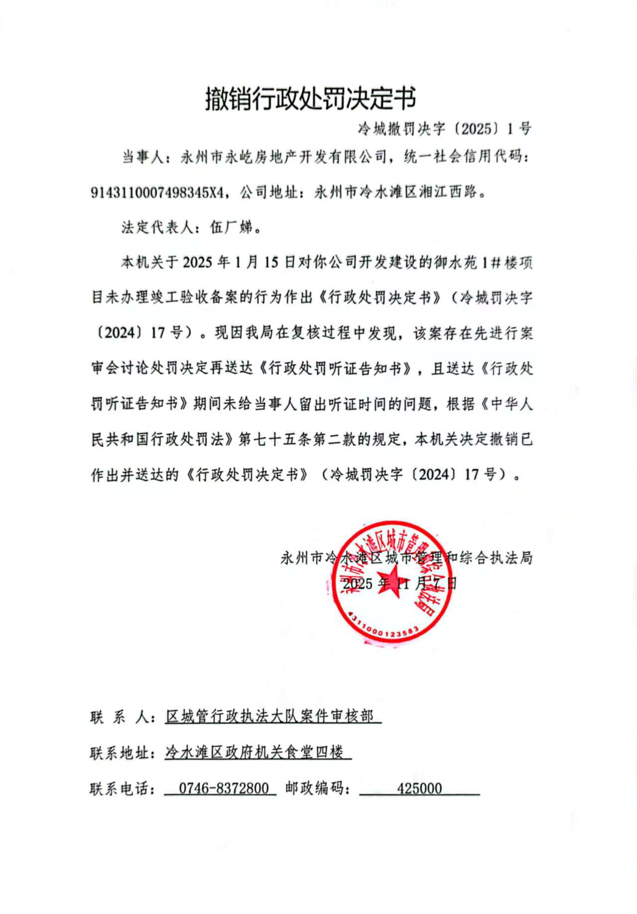 永州市冷水滩区城市管理和综合执法局《撤销行政处罚决定书》(冷城撤罚决字〔2025〕1号)送达公告
