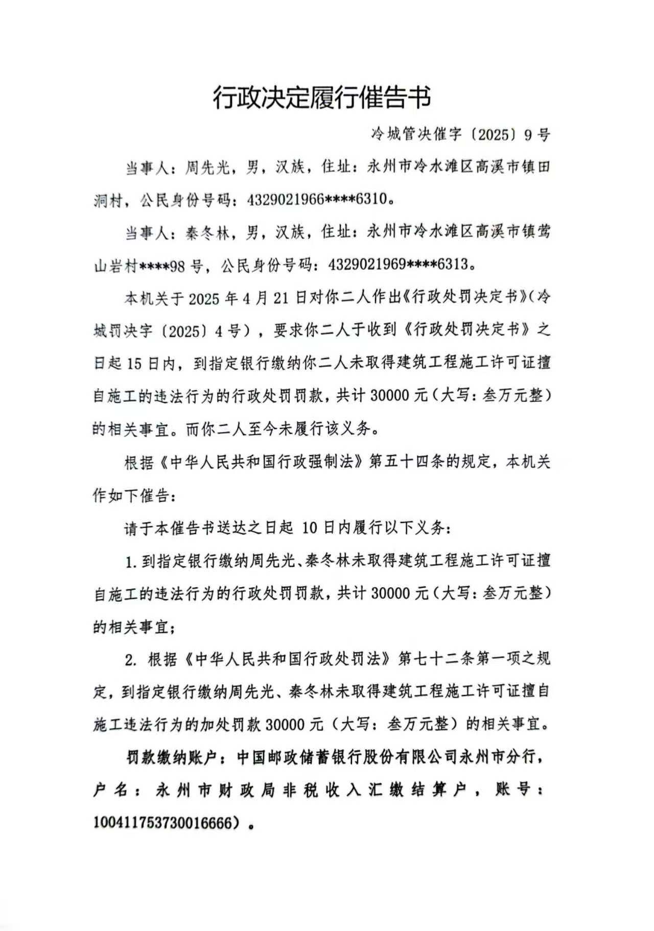 经查,永州市冷水滩区怡景苑小区第12栋房屋(J栋)项目建设过程中,你与秦冬林二人存在未取得施工许可证擅自施工的违法行为,本机关于2025年11月24日作出《行政决定履行催告书》(冷城管决催字〔2025〕9号)。由于无法联系你本人,并且采用其他方式均无法送达,现依据《住房和城乡建设行政处罚程序规定》第三十五条第一款及第三十六条第二款、《中华人民共和国民事诉讼法》第九十五条的规定,向你公告送达《行政决定履行催告书》(冷城管决催字〔2025〕9号),请你自公告发出之日起三十日内到我局领取上述文书正本,逾期即视为送达。(催告书内容如下)