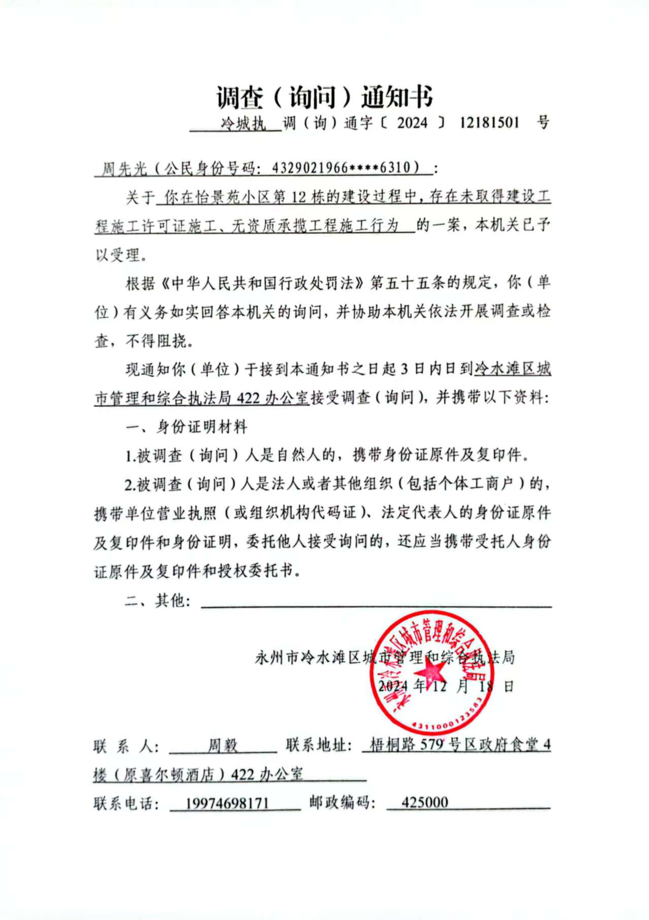 经查,永州市冷水滩区怡景苑小区第12栋房屋(J栋)项目建设过程中,你与秦冬林二人涉嫌存在未取得施工许可证擅自施工、无资质承揽工程的违法行为,本机关于2024年12月18日作出《调查(询问)通知书)》(冷城执调(询)通字〔2024〕12181501号)。由于无法联系你本人,并且采用其他方式均无法送达,现依据《住房和城乡建设行政处罚程序规定》第三十五条第一款及第三十六条第二款、《中华人民共和国民事诉讼法》第九十五条的规定,向你公告送达《调查(询问)通知书)》(冷城执调(询)通字〔2024〕12181501号),请你自公告发出之日起三十日内到我局领取上述文书正本,逾期即视为送达。(通知书内容如下)