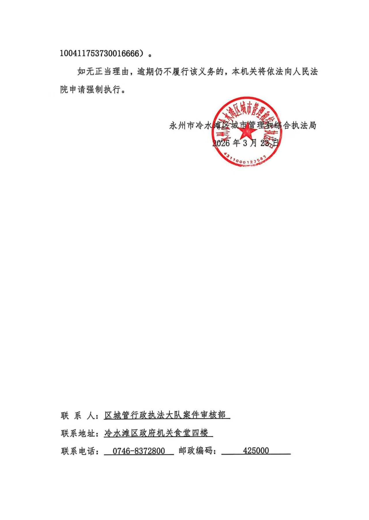 永州市冷水滩区城市管理和综合执法局《行政决定履行催告书》(冷城管决催字〔2026〕1号)送达公告