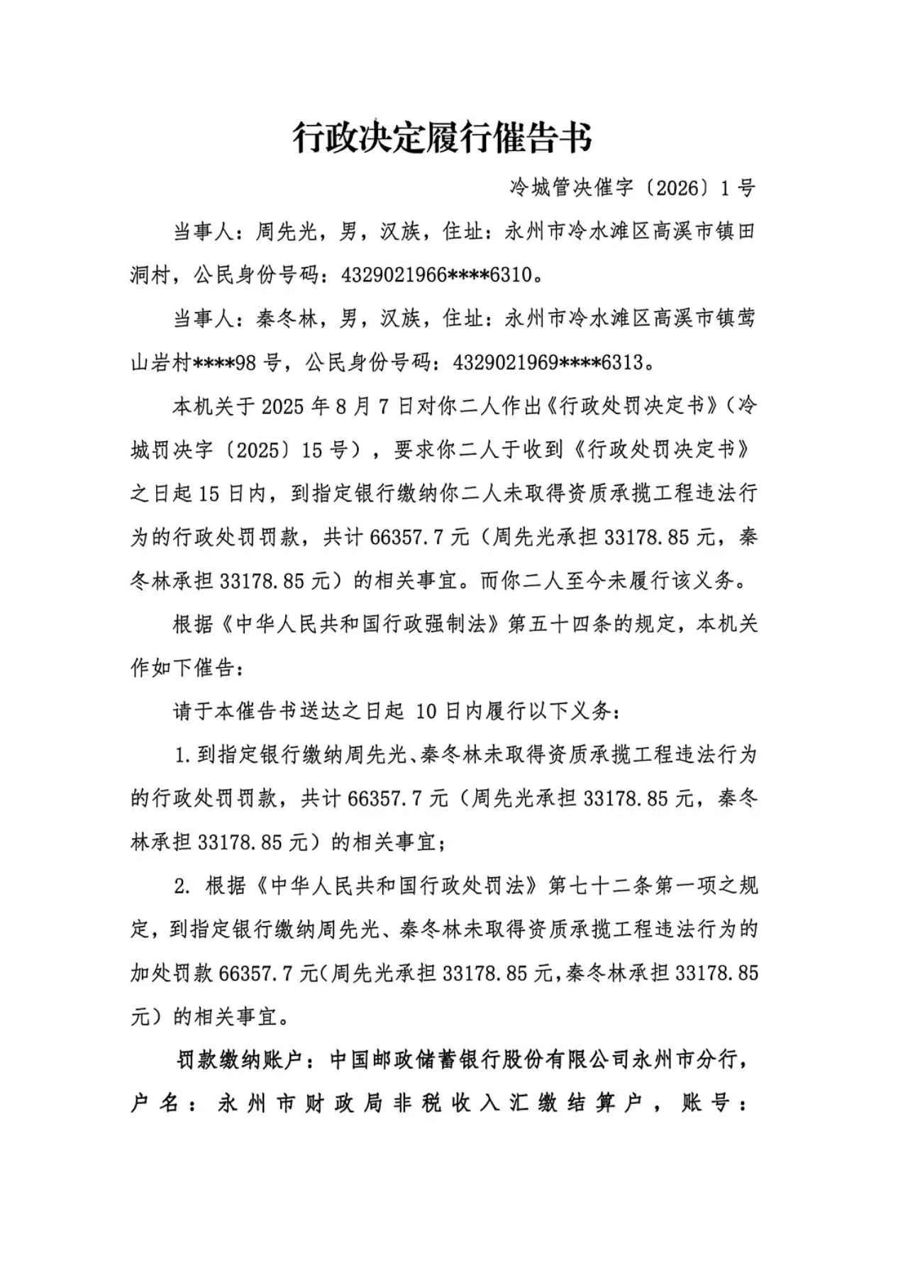 经查,永州市冷水滩区怡景苑小区第12栋房屋(J栋)项目建设过程中,你与秦冬林二人存在未取资质证书承揽工程的违法行为,本机关于2026年3月23日作出《行政决定履行催告书》(冷城管决催字〔2026〕1号)。由于采用其他方式均无法送达,现依据《住房和城乡建设行政处罚程序规定》第三十五条第一款及第三十六条第二款、《中华人民共和国民事诉讼法》第九十五条的规定,向你公告送达《行政决定履行催告书》(冷城管决催字〔2026〕1号),请你自公告发出之日起三十日内到我局领取上述文书正本,逾期即视为送达。(告知书内容如下)