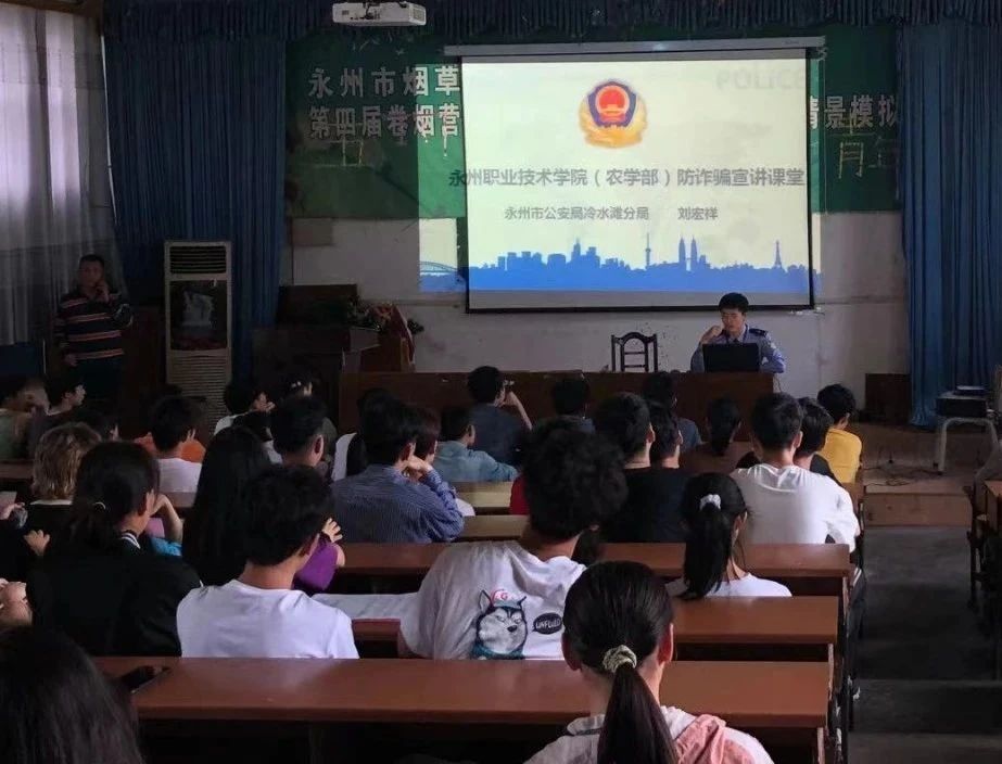 为提高广大学生的辨识电信诈骗能力,防范电信诈骗的意识, 5月25日,冷水滩反电诈中心民警深入永州职业技术学院农学部开展反电诈宣传活动。
