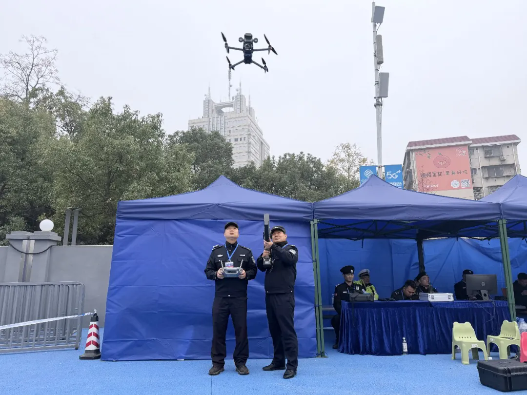 智慧赋能 织密立体防控屏障。 “各点位注意,增派警力引导分流!”赛事期间,冷水滩公安依托“情指行”一体化运行机制,实现赛事安保全程可视化、精准化指挥。分局治安、巡特警等多警种部门协同作战,采用“步巡+无人机巡”的全天候空地协同打防管控模式,在赛场内外等人员密集区域开展动态巡逻。无人机升空巡航,实时回传现场高清画面与热力图,精准监测人群动向,一旦发现风险立即预警;赛场周边科学部署反制设备,对低空飞行物、非法信号进行智能拦截,为赛事筑牢“空中防线”。