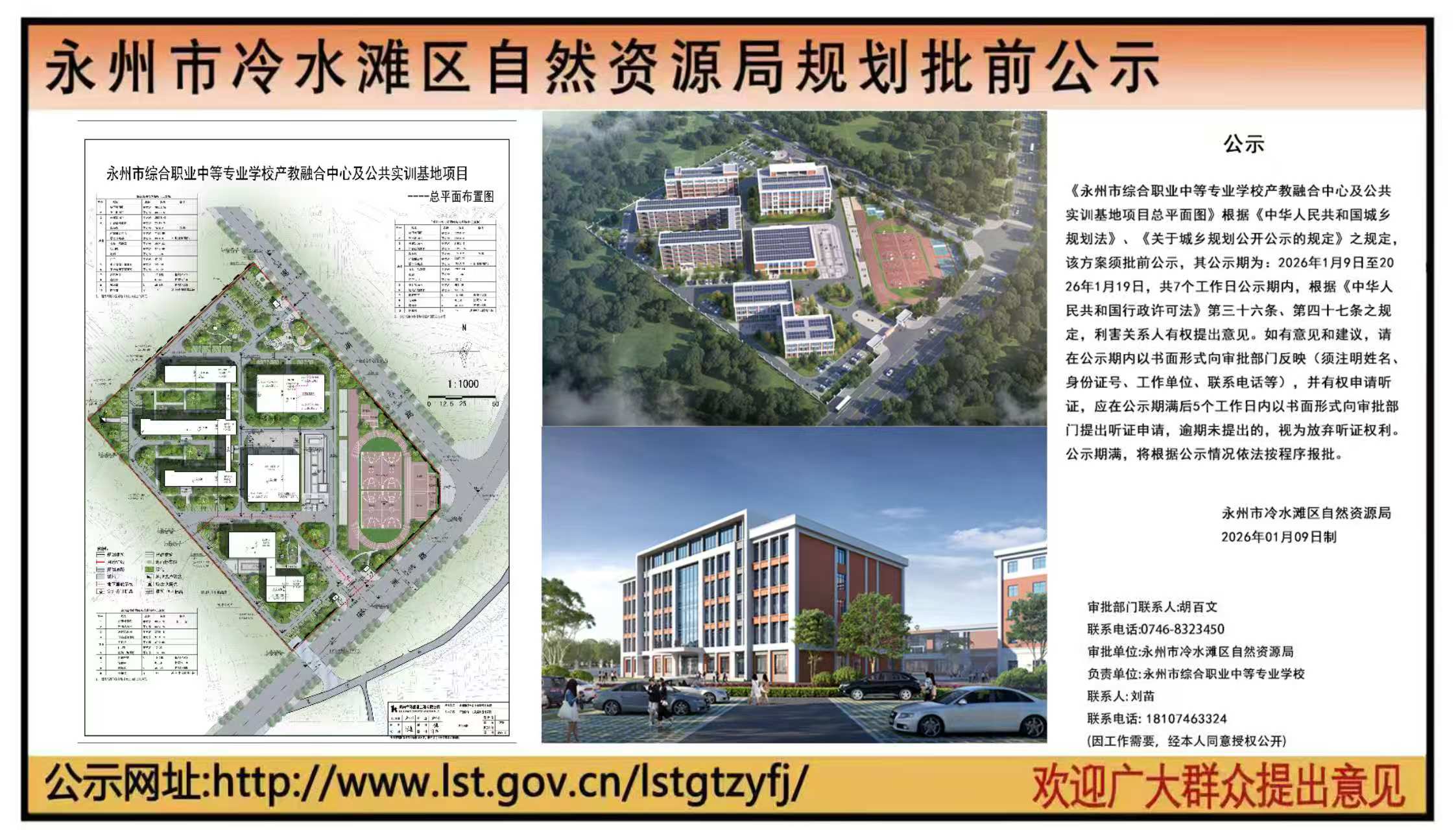 《永州市综合职业中等专业学校产教融合中心及公共实训基地项目总平面图》根据《中华人民共和国城乡规划法》、《关于城乡规划公开公示的规定》之规定,该方案须批前公示,其公示期为:2026年1月9日至2026年1月19日,共7个工作日公示期内,根据《中华人民共和国行政许可法》第三十六条、第四十七条之规定,利害关系人有权提出意见。如有意见和建议,请在公示期内以书面形式向审批部门反映(须注明姓名、身份证号、工作单位、联系电话等),并有权申请听证,应在公示期满后5个工作日内以书面形式向审批部门提出听证申请,逾期未提出的,视为放弃听证权利。公示期满,将根据公示情况依法按程序报批。