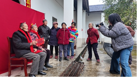 图为狮子岭村党支部助理陈萍为狮子岭村民拍摄全家福