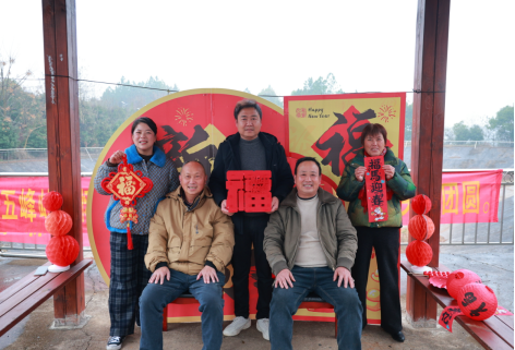 图为五峰岭村民与写好的“福”字拍照留念