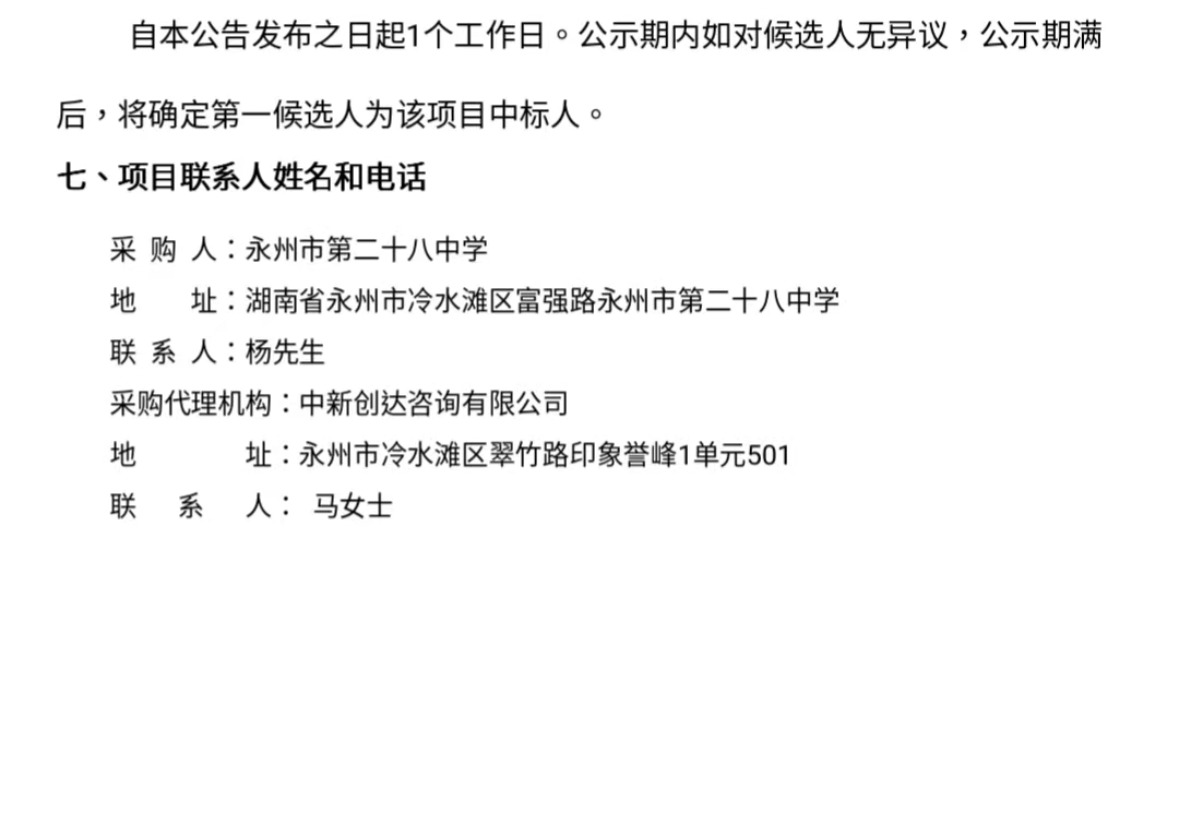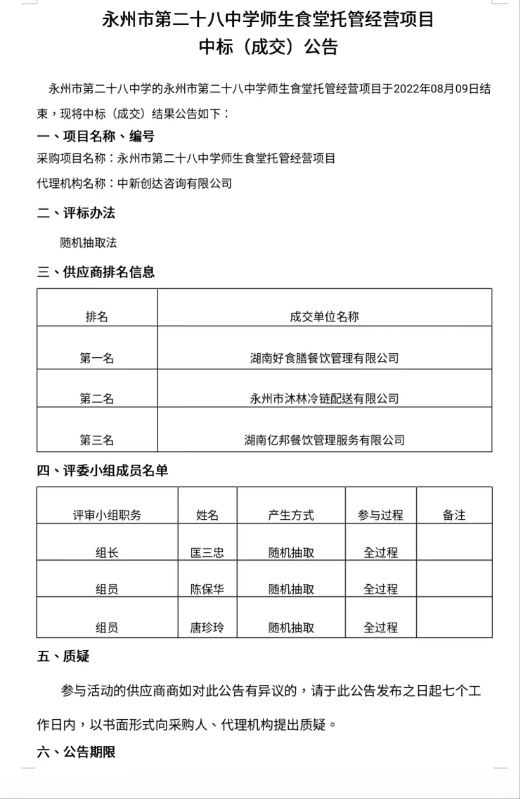 永州市第二十八中学师生食堂托管经营项目中标(成交)公告