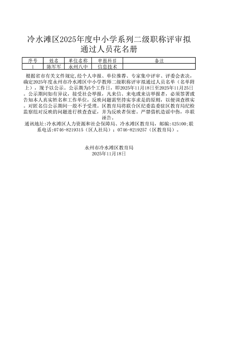 冷水滩区2025年度中小学系列二级职称评审拟通过人员花名册