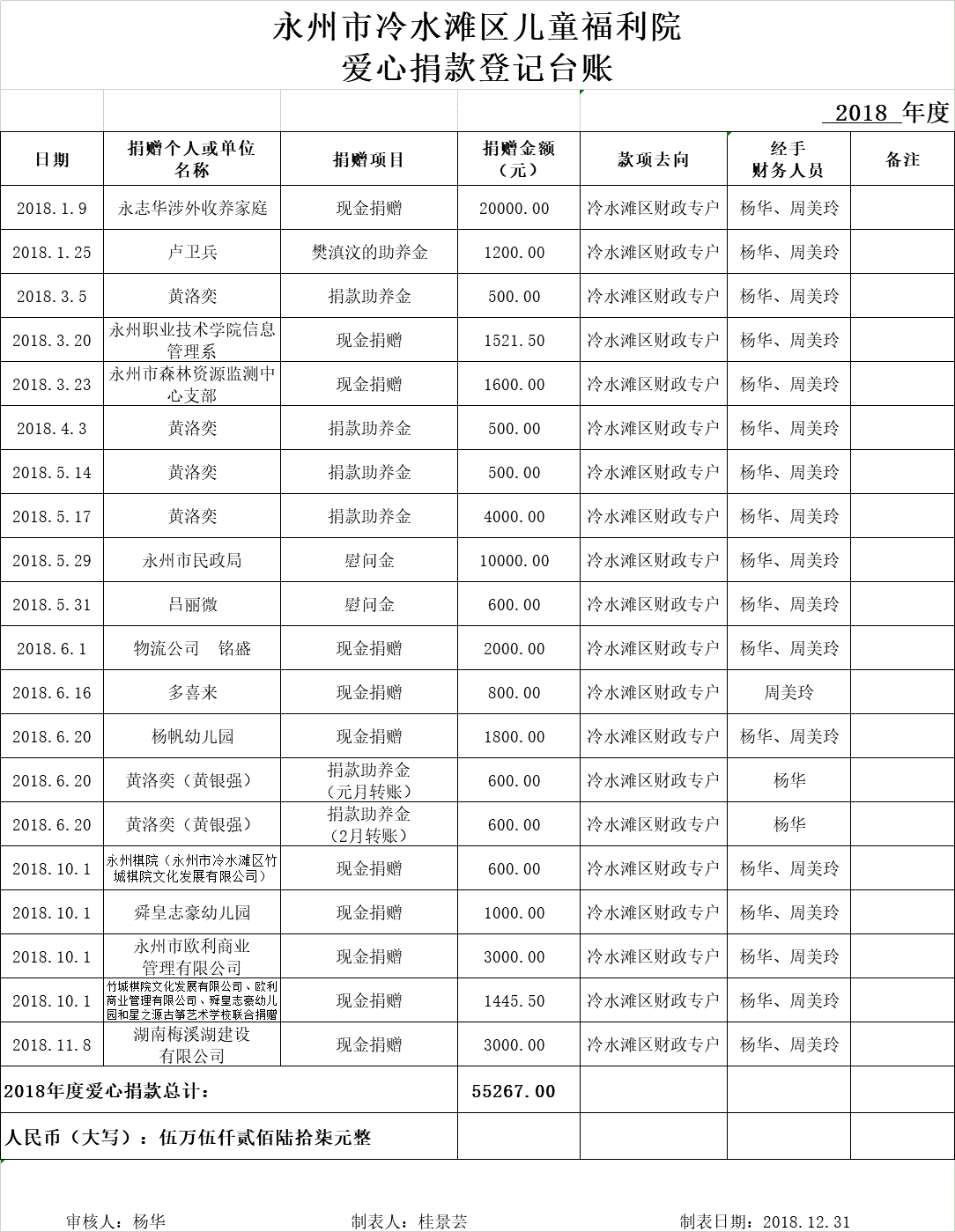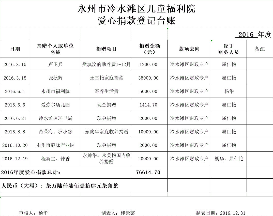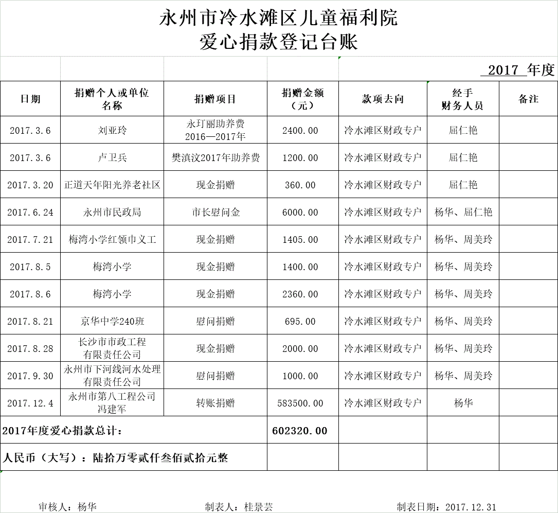 永州市冷水滩区儿童福利院爱心捐款登记台账