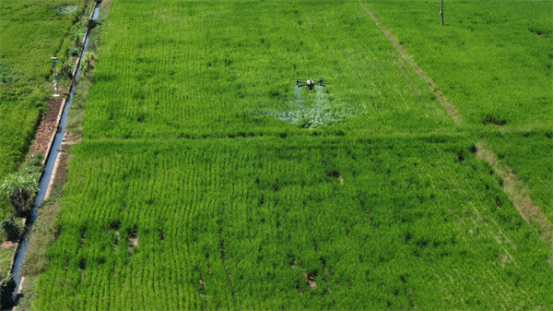在伊塘镇龙井村,万亩水稻随风翻浪、长势喜人,农机手正操控植保无人机进行“一喷多促”作业,植保无人机在稻田上匀速飞行,均匀喷洒农药。