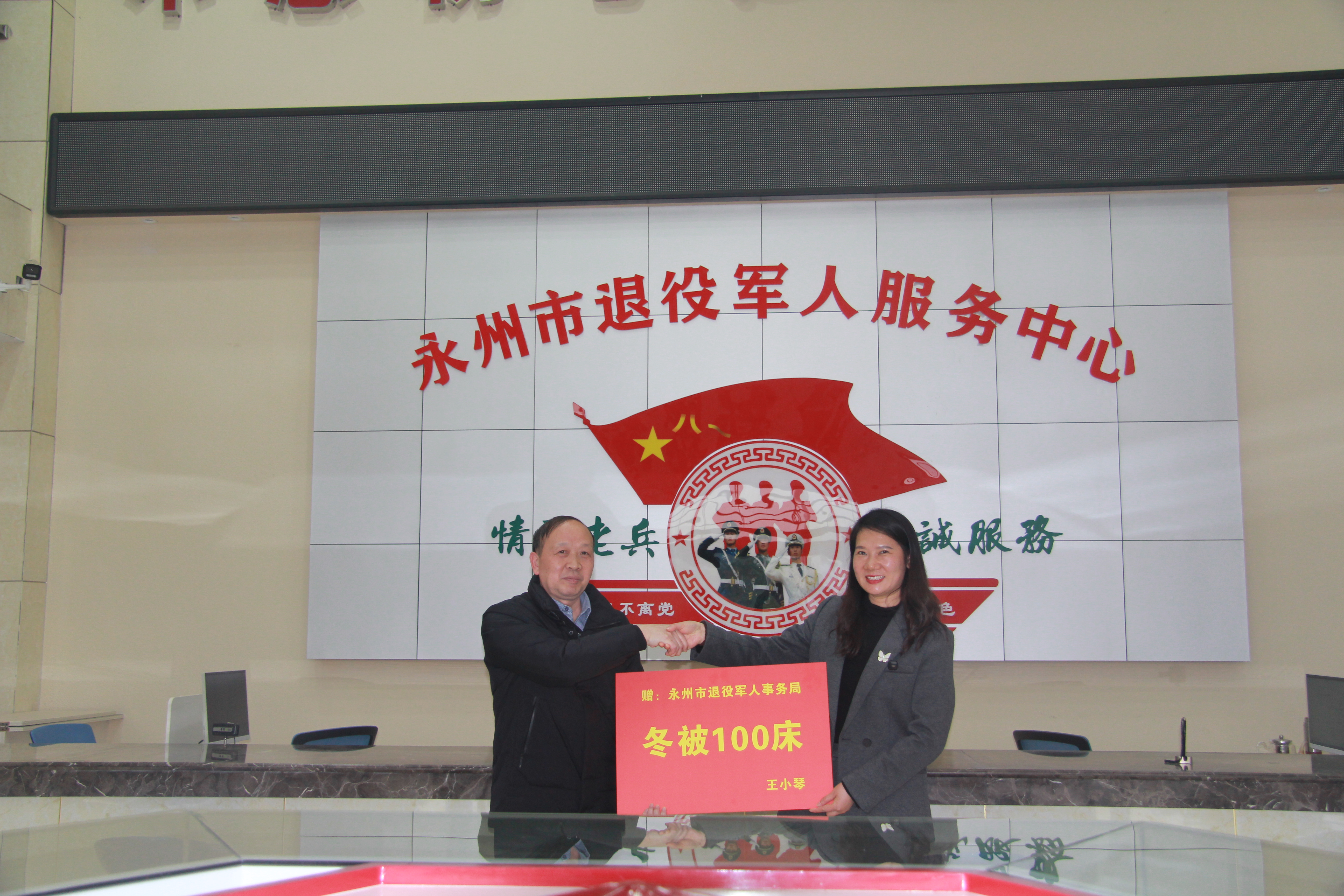 1月16日,江苏昆山兵之家商贸有限公司向湖南省永州市退役军人事务局捐赠100床优质冬被,通过一场简洁庄重的交接仪式,将跨越千里的关怀送达退役军人身边。