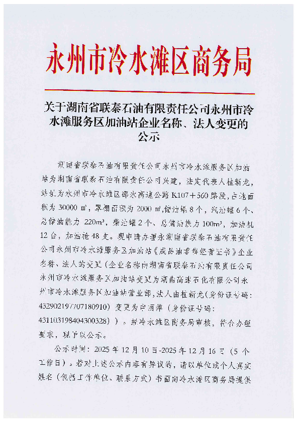 关于湖南省联泰石油有限责任公司永州市冷水滩服务区加油站企业名称、法人变更的公示