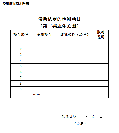六、资质证书副本附表,由资质认可机关填写检测项目批准情况并盖章。