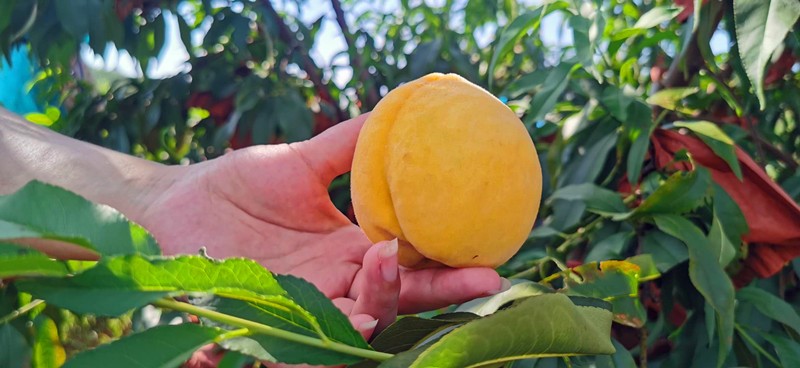 随手扒开一个果袋,露出硕大的黄桃,色泽鲜黄、果香诱人。