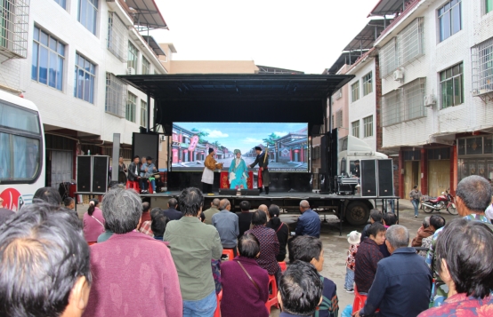 9 月 23 日的花桥街镇灯塘村,秋阳正好,村文化广场早早聚满了村民。大家搬着小板凳,带着孩子,脸上满是期待,不少老人还特意换上整洁衣裳,等候演出开场。随着一段轻快的开场纯音乐响起,主持人走上舞台,热情洋溢的问候瞬间拉近与观众的距离,活动正式拉开帷幕。首个节目舞蹈《盛世花开》率先登场,三位舞者身着色彩明艳的服饰,踩着欢快节奏翩翩起舞,灵动的舞姿如同绽放的鲜花;紧接着,歌曲《军营飞来一只百灵鸟》唱响,清亮婉转的歌声穿梭在广场上空,村民们纷纷举起手机记录;随后,三位演员带来折子戏《杨天禄投亲》,精致的戏服、醇厚的唱腔、细腻的身段,将剧中人物的情感与故事演绎得淋漓尽致,台下戏迷看得入迷,不时发出喝彩声,有老戏迷还轻声跟着哼唱经典唱段。