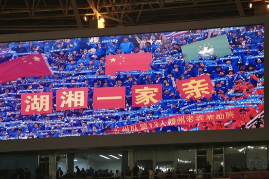 球迷的滚烫热情,彻底点燃了两座城市的激战之夜。在贺龙体育场内,“永州蓝”与“长沙红”交相辉映,“湖湘一家亲”“湘亲湘情”燃至整个看台,两地球迷的助威声此起彼伏、互为呼应;而在三百公里外的永州,早已化身为一座无边界的加油“主场”,从市体育中心近4万人的“第二主场”,到人山人海的各县(市)区的“第三主场”,整个永州汇成了蓝色的海洋。“永州必胜”“狭路相逢永州胜”的铿锵口号,混着“晓了显火”“永远太远,永州不远”“永州不大,创造神话”的方言呐喊,穿透夜色、跨越山河,与贺龙体育场的欢呼精准同频、强力共振。