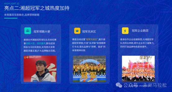 赛前嘉年华、赛道能量补给站、完赛抽奖、企业跑团、冠军领跑大使等 全周期品牌植入场景,让合作不止于广告,更融入跑者体验,提升用户好感与转化效率。