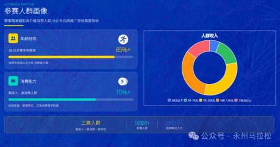 总规模10000人(全马3000人 + 半马7000人),参赛者中 85%为18-55岁青中年,70%以上为高收入、高消费、高学历“三高”人群,与汽车、金融、快消、健康、文旅等行业目标客群高度契合。