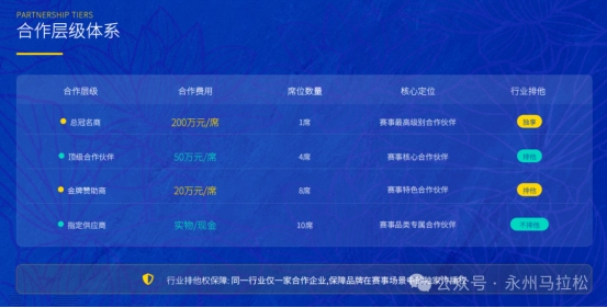 赛事设置四大合作层级,权益清晰、排他保障,助力企业精准匹配营销目标: