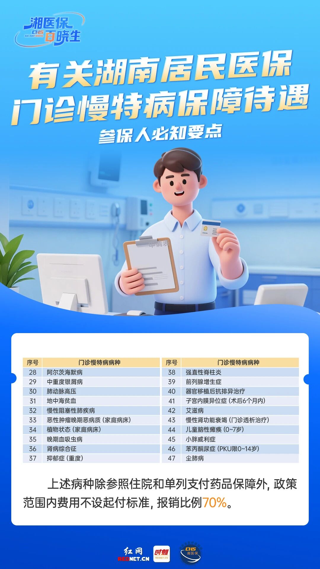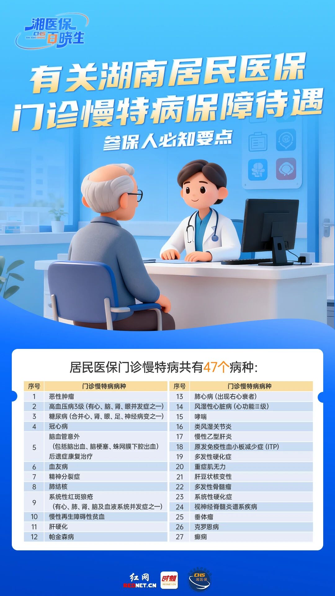医保政策暖民心,保障细节要厘清。湖南居民医保门诊慢特病保障范围再明确,现已涵盖47个病种,从恶性肿瘤、糖尿病、冠心病、肺结核、慢性肾功能衰竭、儿童脑性瘫痪等常见及特殊病种均在列。
