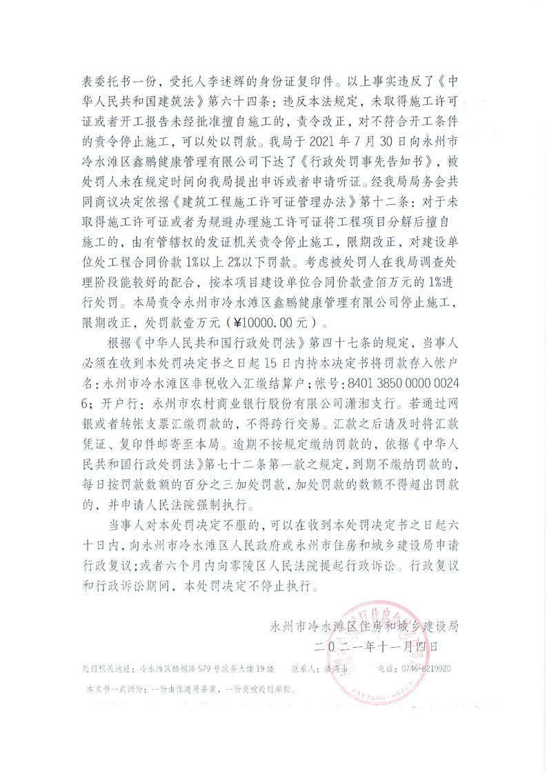 关于对鑫鹏健康管理有限公司的行政处罚决定书